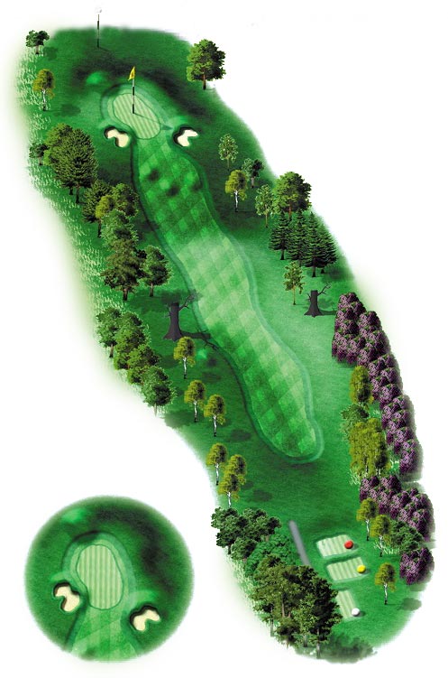 It’s a tricky approach shot with bunkers guarding the front and steep slopes awaiting the long ball. Overshoot in any direction and you’ve got a nasty pitch back up the steep banking.